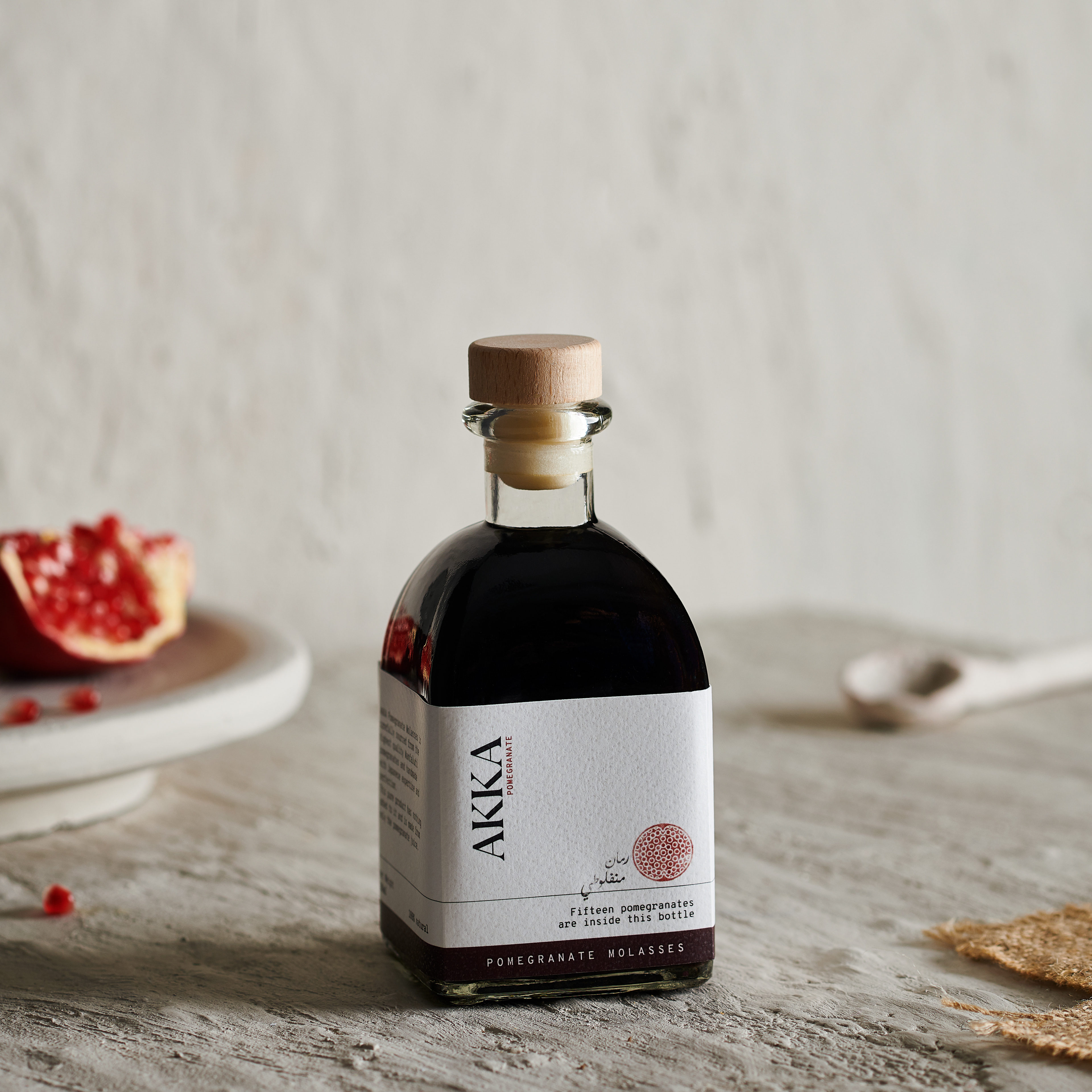 This production minimalism is reflected on the visual identity of the bottle with a sleek simple logo to translate AKKA’s refined delicacies. Championing the beauty and power of the Egyptian Manfaluti pomegranate, the pomegranate stamp is consistent through our visual communication, which turned out to be the perfect symbol of this brand identity.